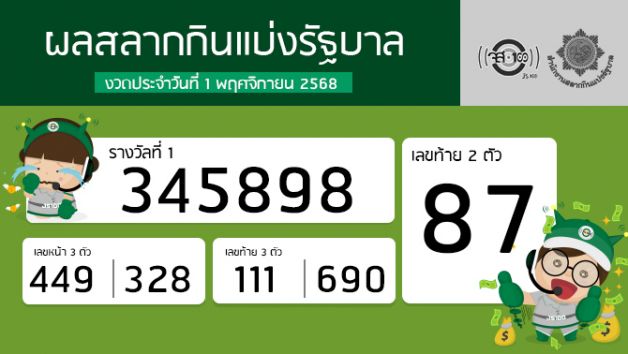(เพิ่มเติม ผลสลากกินแบ่งรัฐบาลงวดประจำวันที่ 1 พฤศจิกายน 2568)