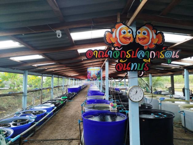 จากนั้นคณะได้เดินทางไปยังศูนย์เรียนรู้ตามแนวพระราชดำริ “การเพาะเลี้ยงสัตว์น้ำ ชายฝั่ง” ของนายอำนวย วงศ์วารี หมู่ที่ 9 ต.คลองขุด อ.ท่าใหม่ จ.จันทบุรี ซึ่งเป็นศูนย์เรียนรู้ที่ได้รับการส่งเสริมจากศูนย์ศึกษาการพัฒนาอ่าวคุ้งกระเบนฯ โดยมีจุดเริ่มต้นจากการใช้เวลาหลังเลิกงาน นำองค์ความรู้ที่ได้จากการทำงานเป็นเจ้าหน้าที่ศูนย์ฯ มาประกอบอาชีพเสริม สร้างรายได้จากการเพาะเลี้ยงปลาการ์ตูนที่ได้รับการสนับสนุนจากศูนย์ฯ และพัฒนาต่อยอดเป็นแหล่งจำหน่ายพันธุ์ปลาการ์ตูนที่ได้รับความนิยมในกลุ่มผู้เลี้ยงปลาสวยงาม มีการเพาะเลี้ยงปลาการ์ตูนหลากสายพันธุ์ รวมถึงการเพาะผสมพันธุ์ผสมใหม่ เพื่อเป็นแหล่งอนุบาลและขยายพันธุ์สัตว์น้ำชายฝั่ง ลดการจับปลาสวยงามตามแนวปะการัง และช่วยฟื้นฟูระบบนิเวศทางทะเลให้กลับมาสมบูรณ์ โดยมีการส่งมอบพันธุ์ปลาการ์ตูนเพื่อปล่อยคืนสู่ทะเลเพื่อการอนุรักษ์พันธุ์สัตว์น้ำชายฝั่งอีกด้วย นับเป็นตัวอย่างของการพัฒนาอาชีพที่รักษาทั้ง “ชีวิตคน” และ “ชีวิตทะเล” ไว้อย่างกลมกลืน