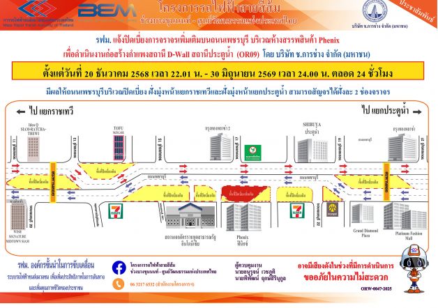 รฟม. แจ้งปิดเบี่ยงการจราจรเพิ่มเติมบนถนนเพชรบุรี เพื่อดำเนินงานก่อสร้างกำแพงสถานี D-wall สถานีประตูน้ำ (OR09) โครงการรถไฟฟ้าสายสีส้ม ช่วงบางขุนนนท์ - ศูนย์วัฒนธรรมแห่งประเทศไทย ตั้งแต่วันที่ 5 ธันวาคม 2568 เวลา 22.00 น. – 30 มิถุนายน 2569 เวลา 24.00 น. ตลอด 24 ชั่วโมง