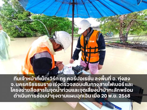 คือแนวทางที่ทรู คอร์ปอเรชั่นใช้ดูแลโครงข่ายในภาวะน้ำท่วมพื้นที่ อำเภอทุ่งสง และอีกหลายอำเภอของ จังหวัดนครศรีธรรมราช โดยเร่งส่งทีมวิศวกรและทีมเน็ตเวิร์กลงพื้นที่ตรวจเช็กและปกป้องสายไฟเบอร์เส้นหลักที่เป็นเส้นเลือดใหญ่ของโครงข่ายก่อนเป็นลำดับแรก จากนั้นเร่งดูแลสถานีฐานและจุดสื่อสารสำคัญในพื้นที่น้ำท่วมและจุดเสี่ยงน้ำป่าทะลัก ตามแผนฉุกเฉิน เพื่อให้มือถือและเน็ตบ้านของประชาชนยังใช้งานได้ต่อเนื่อง แม้อยู่ท่ามกลางสถานการณ์อพยพและการประสานงานช่วยเหลือจากทุกหน่วยงานได้อย่างต่อเนื่อง