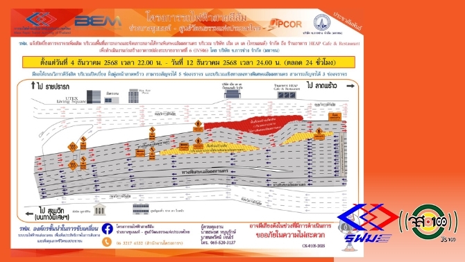 การรถไฟฟ้าขนส่งมวลชนแห่งประเทศไทย (รฟม.) แจ้งว่า บริษัท ช.การช่าง จำกัด (มหาชน) ผู้รับจ้างออกแบบและก่อสร้างอุโมงค์ทางวิ่งและสถานีใต้ดิน โครงการรถไฟฟ้าสายสีส้ม ช่วงบางขุนนนท์ – ศูนย์วัฒนธรรมแห่งประเทศไทย มีความจำเป็นต้องปิดเบี่ยงจราจรเพิ่มเติม 1 ช่องจราจร บนถนนราชปรารภบริเวณทางเลี้ยวเข้าถนนรางน้ำ เพื่อดำเนินงานก่อสร้างกำแพงกันดิน (Diaphragm Wall) สถานีราชปรารภ (OR10) ตั้งแต่วันที่ 29 พฤศจิกายน 2568 เวลา 22.00 น. – 31 มีนาคม 2569 เวลา 24.00 น. ตลอด 24 ชั่วโมง