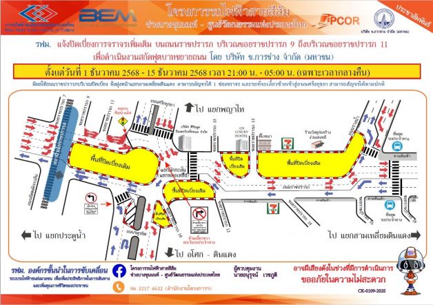 รฟม. แจ้งปิดเบี่ยงจราจรเพิ่มเติม บนถนนราชปรารภบริเวณซอยราชปรารภ 9 ถึงบริเวณซอยราชปรารภ 11 เพื่อดำเนินงานสกัดฟุตบาทขยายถนน สถานีราชปรารภ (OR10) โครงการรถไฟฟ้าสายสีส้ม 1 – 15 ธันวาคม 2568 เวลา 21:00 น. - 05:00 น. (เฉพาะเวลากลางคืน)