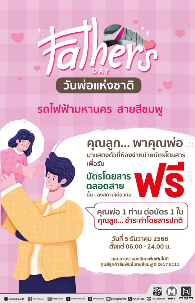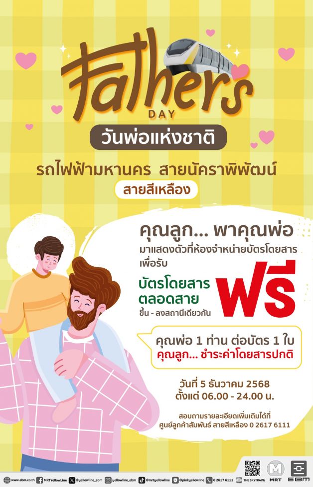 วันที่ 2 ธันวาคม 2568 นายกาจผจญ อุดมธรรมภักดี ผู้ว่าการการรถไฟฟ้าขนส่งมวลชนแห่งประเทศไทย (รฟม.) กล่าวว่า เนื่องในวันพ่อแห่งชาติ 5 ธันวาคม 2568 และเป็นวันคล้ายวันพระบรมราชสมภพ พระบาทสมเด็จพระบรมชนกาธิเบศร มหาภูมิพลอดุลยเดชมหาราช บรมนาถบพิตร โดย รฟม. ได้ร่วมกับผู้รับสัมปทานรถไฟฟ้ามหานคร (รถไฟฟ้า MRT) ทั้ง 4 สาย ได้แก่ บริษัท ทางด่วนและรถไฟฟ้ากรุงเทพ จำกัด (มหาชน) (BEM) ผู้รับสัมปทานให้บริการรถไฟฟ้ามหานคร สายฉลองรัชธรรม (MRT สายสีม่วง) และ รถไฟฟ้ามหานคร สายเฉลิมรัชมงคล (MRT สายสีน้ำเงิน) บริษัท อีสเทิร์น บางกอกโมโนเรล จำกัด (EBM) ผู้รับสัมปทานให้บริการรถไฟฟ้ามหานคร สายนัคราพิพัฒน์ (MRT สายสีเหลือง) และ บริษัท นอร์ทเทิร์น บางกอกโมโนเรล จำกัด (NBM) ผู้รับสัมปทานให้บริการรถไฟฟ้ามหานคร สายสีชมพู จัดกิจกรรมพิเศษยกเว้นค่าโดยสารรถไฟฟ้า MRT ทั้ง 4 สาย สำหรับคุณพ่อที่เดินทางพร้อมลูกในวันที่ 5 ธันวาคม 2568 เพียงคุณพ่อแสดงตัวที่ห้องออกบัตรโดยสารเพื่อรับคูปองหรือบัตรโดยสารรถไฟฟ้าฟรี ได้ทุกสถานี ตลอดระยะเวลาการเปิดให้บริการ โดยลูกชำระค่าโดยสารปกติ ทั้งนี้ เพื่อเป็นการอำนวยความสะดวกและส่งเสริมการเดินทางท่องเที่ยวสถานที่ ต่างๆ รอบเส้นทางรถไฟฟ้า MRT ตลอดจนเป็นการส่งเสริมสร้างความผูกพันในสถาบันครอบครัว