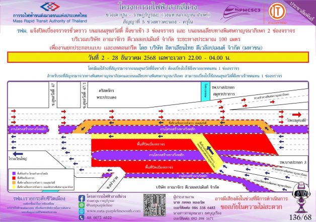 การรถไฟฟ้าขนส่งมวลชนแห่งประเทศไทย (รฟม.) แจ้งว่า บริษัท อิตาเลียนไทย ดีเวล๊อปเมนต์ จำกัด (มหาชน) ผู้รับจ้างงานก่อสร้างทางวิ่งและสถานียกระดับ อาคารจอดรถไฟฟ้าและอาคารจอดแล้วจร โครงการรถไฟฟ้าสายสีม่วง ช่วงเตาปูน - ราษฎร์บูรณะ (วงแหวนกาญจนาภิเษก) สัญญาที่ 5 ช่วงดาวคะนอง - ครุใน มีความจำเป็นต้องปิดเบี่ยงจราจรชั่วคราว บนถนนสุขสวัสดิ์ ฝั่งขาเข้า 3 ช่องจราจร และบนถนนเลียบทางพิเศษกาญจนาภิเษก 2 ช่องจราจร บริเวณบริษัท อาณาจักร ดีเวลอปเม้นท์ จำกัด ระยะทางประมาณ 100 เมตร เพื่องานยกประกอบแบบ และเทคอนกรีต ในวันที่ 2 - 28 ธันวาคม 2568 เฉพาะเวลา 22.00 - 04.00 น. โดยมีผลให้รถที่สัญจรมาจากถนนสุขสวัสดิ์ฝั่งขาเข้า ต้องเบี่ยงไปใช้ฝั่งขาออกทดแทน 1 ช่องจราจร สำหรับรถที่มาจากทางพิเศษกาญจนาภิเษกและถนนเลียบทางพิเศษกาญจนาภิเษก สามารถเบี่ยงไปใช้ถนนสุขสวัสดิ์ ฝั่งขาเข้า ทดแทน 1 ช่องจราจร