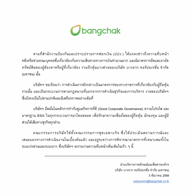 ตามที่สำนักงานป้องกันและปราบปรามการฟอกเงิน (ปปง.) ได้แถลงข่าวถึงความคืบหน้า คดีเครือข่ายคณะบุคคลซึ่งเกี่ยวข้องกับความเสียหายทางการเงินจำนวนมาก และมีมาตรการยึดและอายัดทรัพย์สินของผู้ต้องหาหรือผู้ที่เกี่ยวข้อง รวมถึงหุ้นบางส่วนของบริษัท บางจาก คอร์ปอเรชั่น จำกัด (มหาชน) นั้น