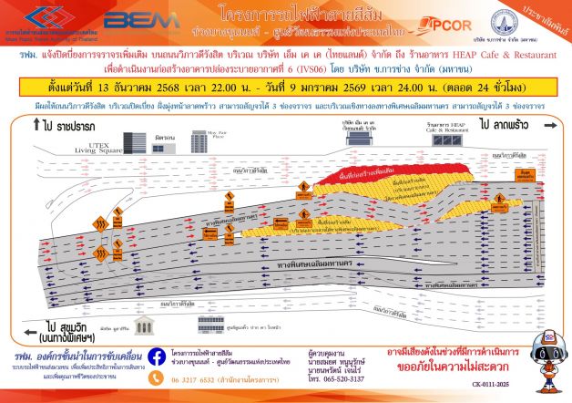 การรถไฟฟ้าขนส่งมวลชนแห่งประเทศไทย (รฟม.) แจ้งว่า บริษัท ช.การช่าง จำกัด (มหาชน) ผู้รับจ้างออกแบบและก่อสร้างอุโมงค์ทางวิ่งและสถานีใต้ดิน โครงการรถไฟฟ้าสายสีส้ม ช่วงบางขุนนนท์ – ศูนย์วัฒนธรรมแห่งประเทศไทย มีความจำเป็นต้องปิดเบี่ยงการจราจรเพิ่มเติม 2 ช่องจราจร บนถนนวิภาวดีรังสิต บริเวณ บริษัท เอ็ม เค เค (ไทยแลนด์) จำกัด ถึง ร้านอาหาร HEAP Cade & Restaurant เพื่อดำเนินงานก่อสร้างอาคารปล่องระบายอากาศที่ 6 (IVS06) ตั้งแต่วันที่ 13 ธันวาคม 2568 เวลา 22.00 น. - วันที่ 9 มกราคม 2569 เวลา 24.00 น. (ตลอด 24 ชั่วโมง) มีผลให้ถนนวิภาวดีรังสิต บริเวณปิดเบี่ยง ฝั่งมุ่งหน้าลาดพร้าว สามารถสัญจรได้ 3 ช่องจราจร และบริเวณเชิงทางลงทางพิเศษเฉลิมมหานคร สามารถสัญได้ 3 ช่องจราจร โดยประชาชนสามารถเข้า – ออกที่พักอาศัยได้ตามปกติ