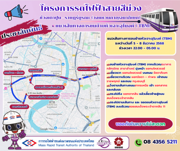 แนวเส้นทางขนย้ายหัวเจาะอุโมงค์ (TBM) โดย บริษัท ยูนิค เอ็นจิเนียริ่ง แอนด์ คอนสตรัคชั่น จำกัด (มหาชน) ผู้รับจ้างงานออกแบบและก่อสร้างอุโมงค์ทางวิ่งและสถานีใต้ดิน โครงการรถไฟฟ้าสายสีม่วง ช่วงเตาปูน - ราษฎร์บูรณะ (วงแหวนกาญจนาภิเษก) สัญญาที่ 4 ช่วงสะพานพุทธ - ดาวคะนองระหว่างวันที่ 5 - 8 ธันวาคม 2568 ช่วงเวลา 22.00 - 05.00 น.
