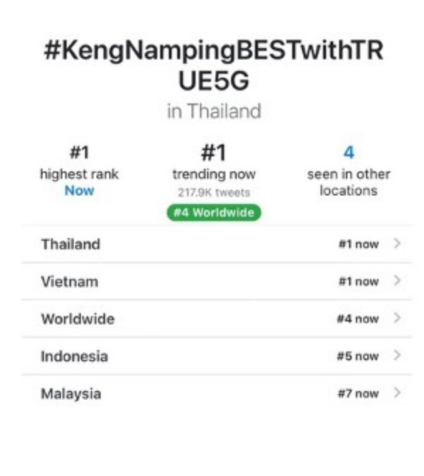 สร้างปรากฏการณ์สยามแตก! แฟนคลับแห่รับ ‘เก่ง-น้ำปิง’ เข้าครอบครัวทรู การันตีสัญญาณแรง ส่งมอบความสุขทะลุพิกัดสยาม สะเทือนโซเชียล ดันแฮชแท็ก #KengNampingBESTwithTRUE5G จนพุ่งชนเพดาน อันดับ 1 เทรนด์ x ไทยและเวียดนาม แบบม้วนเดียวจบ แถมยังแรงไกลไปถึง อันดับ 4 ของโลก พร้อมยึดพื้นที่เทรนด์ในอินโดนีเซียและมาเลเซีย "ด้วยยอด repost ใน X ถล่มทลายกว่า 2.06 ล้านข้อความและ Engagement มากกว่า 4 ล้าน (ข้อมูล ณ วันที่ 7 ธ.ค. 2568) การันตีความปังของคู่จิ้นขวัญใจมหาชน และสัญญาณทรูที่เชื่อมความรักของแฟนๆ ถึงศิลปินได้เร็ว แรง และชัดเจนที่สุดในวินาทีนี้!