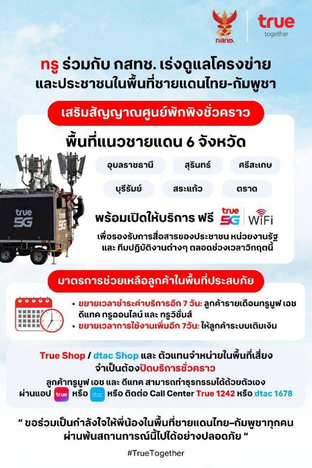 ทรู ร่วมกับ กสทช. เร่งดูแลโครงข่ายและประชาชนในพื้นที่ชายแดนไทย–กัมพูชา เร่งระดมรถโมบายล์ COW เสริมสัญญาณศูนย์พักพิงฯ พื้นที่ชายแดนไทย-กัมพูชา พร้อมออกมาตรการช่วยเหลือลูกค้าเร่งด่วน