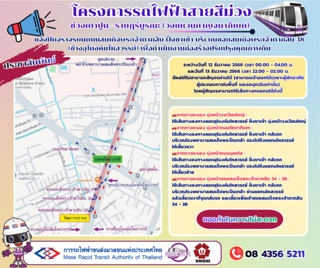 โครงการรถไฟฟ้าสายสีม่วง ช่วงเตาปูน - ราษฎร์บูรณะ (วงแหวนกาญจนาภิเษก) แจ้งปิดจราจรบนถนนสมเด็จพระเจ้าตากสิน ฝั่งขาเข้า บริเวณซอยสมเด็จพระเจ้าตากสิน 38 (ข้างอุโมงค์มไหสวรรย์) เพื่อดำเนินงานก่อสร้างปรับปรุงคุณภาพดิน ระหว่างวันที่ 12 ธันวาคม 2568 เวลา 00.00 - 04.00 น. และวันที่ 13 ธันวาคม 2568 เวลา 22.00 - 02.00 น. มีผลให้ไม่สามารถสัญจรผ่านได้ (สามารถเข้าออกได้เฉพาะผู้พักอาศัย