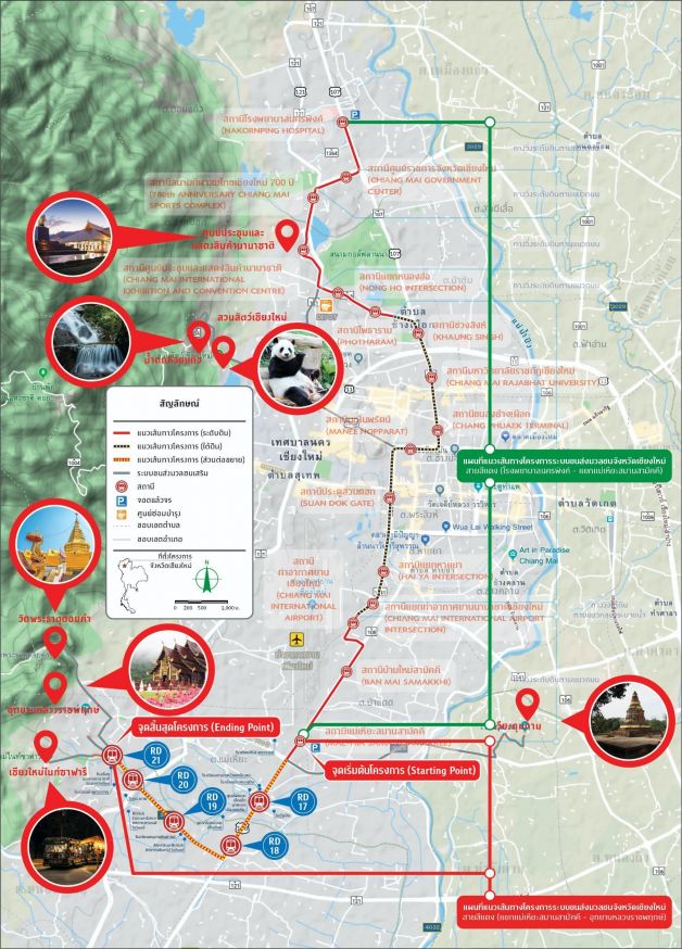 สมานสามัคคี วิ่งไปตามทางหลวงหมายเลข 108 จากนั้นเลี้ยวขวาที่แยกพืชสวนโลก วิ่งไปตามทางหลวงชนบท ชม.3028 และตัดผ่านทางหลวงหมายเลข 121 ที่แยกราชพฤกษ์ ไปสิ้นสุดที่อุทยานราชพฤกษ์ บริเวณวงเวียนช้าง ซึ่งเมื่อโครงการแล้วเสร็จจะช่วยเพิ่มทางเลือกในการเดินทางที่มีประสิทธิภาพและมาตรฐานรวมถึงมีความสะดวก รวดเร็ว และความปลอดภัย ให้แก่ประชาชนและนักท่องเที่ยวในจังหวัดเชียงใหม่ รวมถึงสามารถลดการใช้รถยนต์โดยรวมบนท้องถนน จึงช่วยลดปริมาณมลพิษในอากาศที่เกิดจากการใช้น้ำมันเชื้อเพลิงของรถยนต์ได้อีกด้วย สำหรับท่านที่สนใจสามารถติดตามข้อมูลโครงการฯ ได้ที่เว็บไซต์ http://www.chiangmai-transitredline.com ,