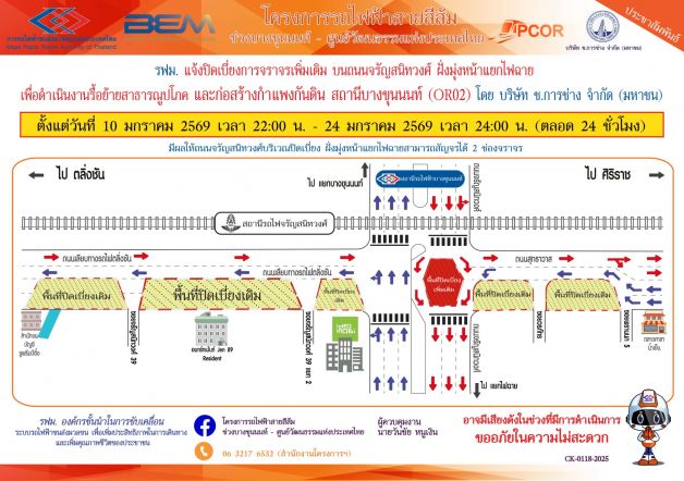 การรถไฟฟ้าขนส่งมวลชนแห่งประเทศไทย (รฟม.) แจ้งว่า บริษัท ช.การช่าง จำกัด (มหาชน) ผู้รับจ้างออกแบบและก่อสร้างอุโมงค์ทางวิ่งและสถานีใต้ดิน โครงการรถไฟฟ้าสายสีส้ม ช่วงบางขุนนนท์ – ศูนย์วัฒนธรรมแห่งประเทศไทย มีความจำเป็นต้องปิดเบี่ยงการจราจร 3 ช่องจราจร เพิ่มเติม บนถนนจรัญสนิทวงศ์ ฝั่งมุ่งหน้าแยกไฟฉาย เพื่อดำเนินงานรื้อย้ายสาธารณูปโภค และก่อสร้างกำแพงกันดิน สถานีบางขุนนนท์ (OR02) ตั้งแต่วันที่ 10 มกราคม 2569 เวลา 22:00 น. – 24 มกราคม 2569 เวลา 24:00 น. (ตลอด 24 ชั่วโมง) มีผลให้ถนนจรัญสนิทวงศ์บริเวณปิดเบี่ยง ฝั่งมุ่งหน้าแยกไฟฉายสามารถสัญจรได้ 2 ช่องจราจร โดยประชาชนสามารถเข้า – ออกที่พักอาศัยได้ตามปกติ