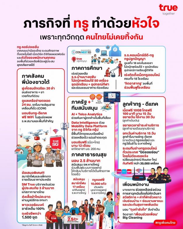 ในช่วงสถานการณ์ที่ผ่านมา ทรู ได้ดำเนิน "ภารกิจแห่งหัวใจ" เร่งฟื้นฟูและเยียวยาผู้ประสบอุทกภัยที่หาดใหญ่อย่างครอบคลุม ทั้งด้านการศึกษา คืนอนาคตเด็กไทยที่โรงเรียนบ้านบางแฟ่บและโรงเรียนเครือข่ายรวม 18 แห่ง ผ่านการมอบโน้ตบุ๊ก สื่อดิจิทัลและฟื้นฟูอาคารเพื่อให้การเรียนการสอนดำเนินการต่อได้ทันที ด้านเทคโนโลยีและนวัตกรรม นำศักยภาพ AI และ Mobility Data สนับสนุนภาครัฐวิเคราะห์พิกัดกู้ภัยและวางแผนอพยพ พร้อมส่งฝูงโดรนอัจฉริยะ 20 ลำ ขนส่งยาและอาหารในพื้นที่ที่เข้าถึงยาก ควบคู่ไปกับการรักษาเสถียรภาพเครือข่ายตลอด 24 ชั่วโมง พร้อมนำรถชุมสายเคลื่อนที่เร็ว (COW) เสริมสัญญาณในพื้นที่น้ำท่วม ด้านการดูแลลูกค้า ยกเว้นค่าบริการสำหรับลูกค้ามือถือ ทรูออนไลน์ และทรูวิชั่นส์ พร้อมขยายวันใช้งานและขยายเวลาชำระค่าบริการ มอบซิมทรู–ดีแทค และ WiFi ฟรี ในศูนย์อพยพ รพ.สนาม ทั้งยังระดมช่างทรูออนไลน์จากทั่วประเทศทำภารกิจ “ปิดซอยซ่อม” ลงพื้นที่เปลี่ยนอุปกรณ์โมเด็มถึงบ้านลูกค้าครบ 100% โดยไม่ต้องรอให้ลูกค้าแจ้ง ตลอดจนส่งต่อกำลังใจผ่านการบริจาคเงินและถุงยังชีพ นอกจากนี้ยังสนับสนุนบุคลากรทางการแพทย์และผู้ทำงานด้านสาธารณสุขด้วยส่วนลดสมาร์ทโฟนและแพ็กเกจราคาพิเศษ เพื่อเป็นพลังสำคัญในการขับเคลื่อนให้หาดใหญ่กลับมาเข้มแข็งอีกครั้ง