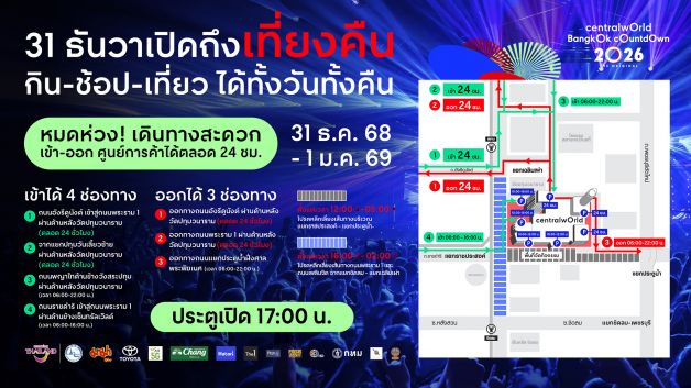 กรุงเทพฯ – บริษัท เซ็นทรัลพัฒนา จำกัด (มหาชน) ชวนคนไทยและนักท่องเที่ยวจากทั่วโลก ร่วมฉลองวินาทีข้ามปีอย่างยิ่งใหญ่ กับงาน “centralwOrld Bangkok Countdown 2026 The Original – A Tribute to Love” แลนด์มาร์กเคานต์ดาวน์ระดับโลกใจกลางกรุงเทพฯ ณ ศูนย์การค้าเซ็นทรัลเวิลด์ ตอกย้ำ Times Square of Asia ต้นแบบงานเคานต์ดาวน์ของประเทศไทยมากว่า 2 ทศวรรษ ฟรีคอนเสิร์ต ปลอดภัย เดินทางสะดวก เพื่ออำนวยความสะดวกให้ผู้ร่วมงานเดินทางได้อย่างราบรื่น เซ็นทรัลเวิลด์เตรียมความพร้อมด้านการจราจรและการเดินทางแบบรอบด้าน เชื่อมต่อสะดวกทุกเส้นทาง พร้อมการรักษาความปลอดภัยระดับสูงสุด
