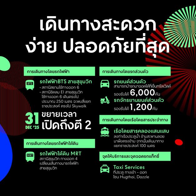 ประตูเปิดตั้งแต่ 17.00 น. เดินทางสะดวก รถไฟฟ้าให้บริการถึงตี 2 และที่จอดรถกว่า 6,000 คัน และรถจักรยานยนต์ 1,500 คัน เข้าออกได้หลายเส้นทาง: