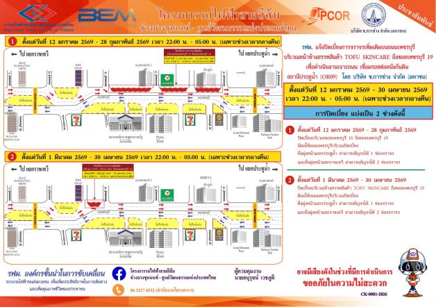 2.วันที่ 1 มีนาคม 2569 – 30 เมษายน 2569 ถนนเพชรบุรี บริเวณห้างสรรพสินค้า TOFU SKINCARE ถึงซอยเพชรบุรี 15 ปิดเบี่ยง 1 ช่องจราจร มีผลให้ถนนเพชรบุรีบริเวณปิดเบี่ยง ฝั่งมุ่งหน้าแยกประตูน้ำ สามารถสัญจรได้ 1 ช่องจราจร และฝั่งมุ่งหน้าแยกราชเทวี สามารถสัญจรได้ 2 ช่องจราจร