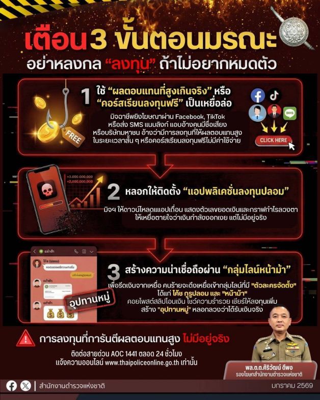 ให้ผลตอบแทนสูงเป็นเหยื่อล่อ ยิงโฆษณาโซเชียล อ้างคนดัง/บริษัทใหญ่ ชวนลงทุนที่กำไรสูงเกินจริงหรือคอร์สเรียนฟรี