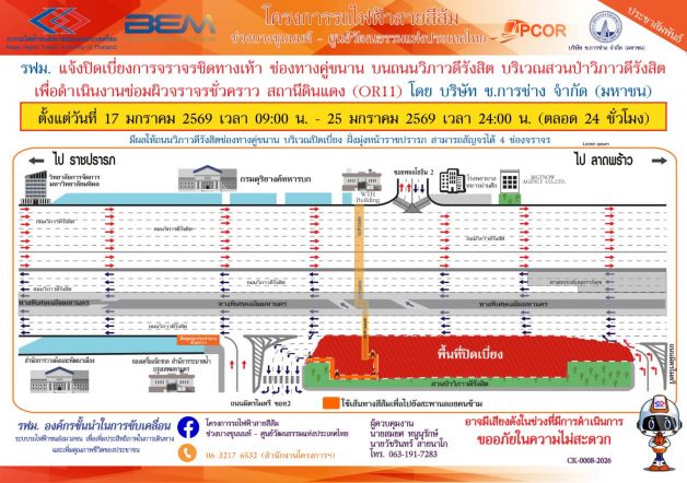 #ประชาสัมพันธ์แจ้งปิดเบี่ยงจราจร ชิดทางเท้า ช่องทางคู่ขนาน บนถนนวิภาวดีรังสิต บริเวณสวนป่าวิภาวดีรังสิต เพื่อดำเนินงานซ่อมผิวจราจรชั่วคราว สถานีดินแดง (OR11) โครงการรถไฟฟ้าสายสีส้ม ช่วงบางขุนนนท์ – ศูนย์วัฒนธรรมแห่งประเทศไทย ตั้งแต่วันที่ 17 มกราคม 2569 เวลา 09.00 น. – 25 มกราคม 2569 เวลา 24.00 น. (ตลอด 24 ชั่วโมง)