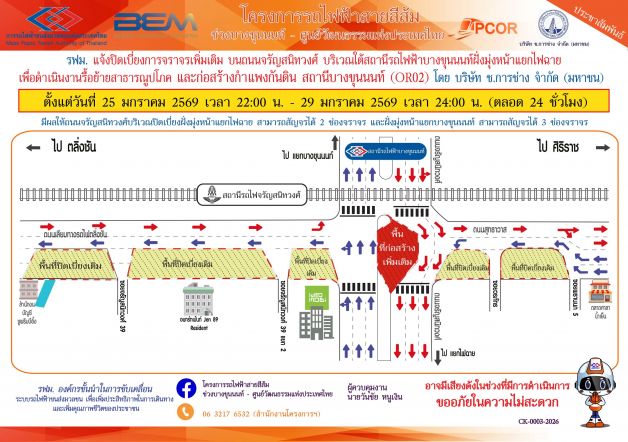 การรถไฟฟ้าขนส่งมวลชนแห่งประเทศไทย (รฟม.) แจ้งว่า บริษัท ช.การช่าง จำกัด (มหาชน) ผู้รับจ้างออกแบบและก่อสร้างอุโมงค์ทางวิ่งและสถานีใต้ดิน โครงการรถไฟฟ้าสายสีส้ม ช่วงบางขุนนนท์ - ศูนย์วัฒนธรรมแห่งประเทศไทย มีความจำเป็นต้องปิดเบี่ยงการจราจรเพิ่มเติม บนถนนจรัญสนิทวงศ์ บริเวณเกาะกลางใต้สถานีรถไฟฟ้า บางขุนนนท์ ฝั่งมุ่งหน้าแยกไฟฉาย เพื่อดำเนินงานรื้อย้ายสาธารณูปโภค และก่อสร้างกำแพงกันดิน สถานีบางขุนนนท์ (OR02) ตั้งแต่วันที่ 25 มกราคม 2569 เวลา 22:00 น. – 29 มกราคม 2569 เวลา 24:00 น. (ตลอด 24 ชั่วโมง) มีผลให้ถนนจรัญสนิทวงศ์บริเวณปิดเบี่ยงฝั่งมุ่งหน้าแยกไฟฉาย สามารถสัญจรได้ 2 ช่องจราจร และฝั่งมุ่งหน้าแยกบางขุนนนท์ สามารถสัญจรได้ 3 ช่องจราจร โดยประชาชนสามารถเข้า – ออกที่พักอาศัยได้ตามปกติ