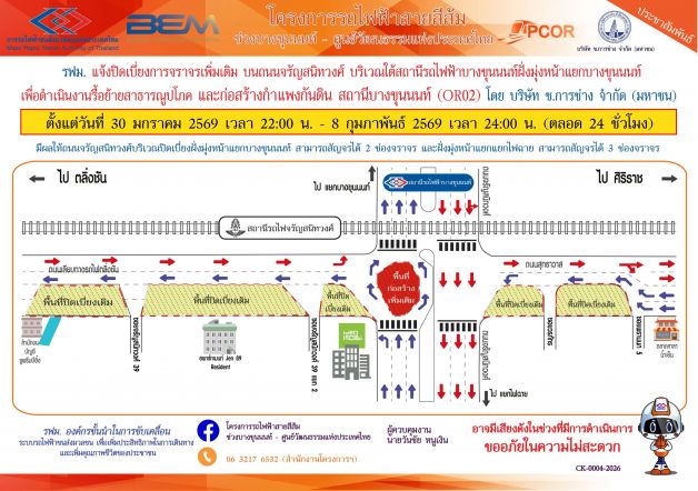 การรถไฟฟ้าขนส่งมวลชนแห่งประเทศไทย (รฟม.) แจ้งว่า บริษัท ช.การช่าง จำกัด (มหาชน) ผู้รับจ้างออกแบบและก่อสร้างอุโมงค์ทางวิ่งและสถานีใต้ดิน โครงการรถไฟฟ้าสายสีส้ม ช่วงบางขุนนนท์ – ศูนย์วัฒนธรรมแห่งประเทศไทย มีความจำเป็นต้องปิดเบี่ยงการจราจรเพิ่มเติม บนถนนจรัญสนิทวงศ์ บริเวณใต้สถานีรถไฟฟ้าบางขุนนนท์ ฝั่งมุ่งหน้าแยกบางขุนนนท์ เพื่อดำเนินงานรื้อย้ายสาธารณูปโภค และก่อสร้างกำแพงกันดิน สถานีบางขุนนนท์ (OR02) ตั้งแต่วันที่ 30 มกราคม 2569 เวลา 22:00 น. - 8 กุมภาพันธ์ 2569 เวลา 24:00 น. (ตลอด 24 ชั่วโมง) มีผลให้ถนนจรัญสนิทวงศ์บริเวณปิดเบี่ยงฝั่งมุ่งหน้าแยกบางขุนนนท์ สามารถสัญจรได้ 2 ช่องจราจร และฝั่งมุ่งหน้าแยกไฟฉาย สามารถสัญจรได้ 3 ช่องจราจร โดยประชาชนสามารถเข้า - ออกที่พักอาศัยได้ตามปกติ