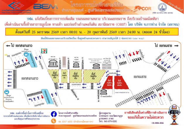 การรถไฟฟ้าขนส่งมวลชนแห่งประเทศไทย (รฟม.) แจ้งว่า บริษัท ช.การช่าง จำกัด (มหาชน) ผู้รับจ้างออกแบบและก่อสร้างอุโมงค์ทางวิ่งและสถานีใต้ดิน โครงการรถไฟฟ้าสายสีส้ม ช่วงบางขุนนนท์ - ศูนย์วัฒนธรรมแห่งประเทศไทย มีความจำเป็นต้องปิดเบี่ยงการจราจรเพิ่มเติม จำนวน 4 ช่องจราจรชิดทางเท้า บนถนนหลานหลวง ฝั่งมุ่งหน้าแยกสะพานขาว ตั้งแต่บริเวณแยกยมราช ถึงบริเวณบ้านมนังคศิลา เพื่อดำเนินงานรื้อย้ายสาธารณูปโภค ทางเข้า และก่อสร้างกำแพงกันดิน สถานียมราช (OR07) ตั้งแต่วันที่ 25 มกราคม 2569 เวลา 00:01 น. –