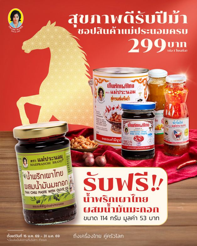โปรโมชัน : สุขภาพดีรับปีมะเมีย ช้อปครบ 299 บาท รับฟรี น้ำพริกเผาไทยผสมน้ำมันมะกอกขนาด 114 กรัม (มูลค่า 53 บาท) !!