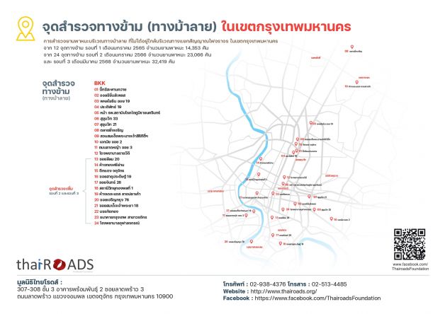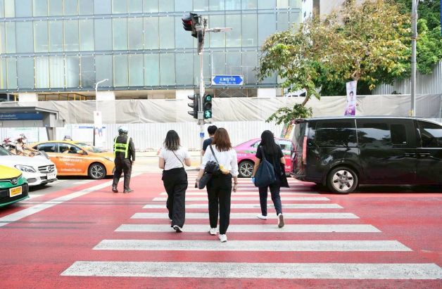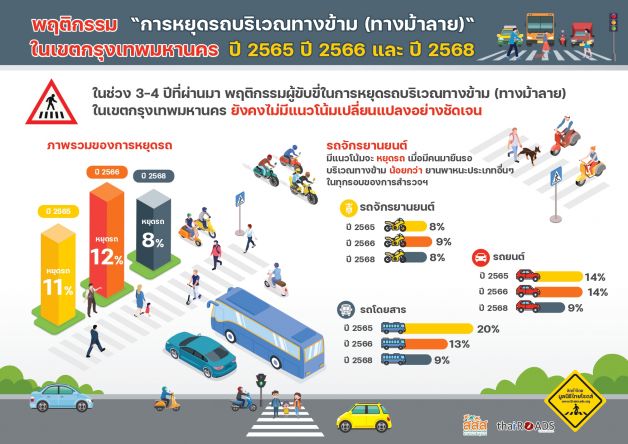 “สสส. ร่วมกับ มูลนิธิไทยโรดส์ สำรวจพฤติกรรมการหยุดรถบริเวณทางข้ามหรือทางม้าลาย เขตกรุงเทพฯ จำนวน 24 จุด ที่อยู่กลางช่วงถนน ไม่ติดทางแยกและสัญญาณไฟจราจร (mid-block) ระหว่างวันที่ 11-19 ม.ค. 2568 ครอบคลุมยานพาหนะ 32,419 คัน พบว่า เมื่อมีคนเดินเท้ายืนรอข้ามถนน มีผู้ขับขี่หยุดรถให้เพียง 8% ขณะที่ 92% ไม่หยุดรถ โดยรถจักรยานยนต์หยุดรถน้อยที่สุดคือ 8% ส่วนรถยนต์และรถโดยสารหยุดรถ 9% เมื่อเปรียบเทียบย้อนหลัง 3 ปี 2565-2566 และ 2568 พบว่า สถานการณ์ความปลอดภัยบริเวณทางข้ามยังไม่ดีขึ้น โดยเฉพาะรถโดยสารที่มีอัตราการหยุดรถลดลงจาก 20% ในปี 2565 เหลือ 13% ในปี 2566 และเหลือเพียง 9% ในปี 2568 ขณะที่ภาพรวมรถทุกประเภทยังลดลงจาก 12% ในปี 2566 เหลือ 8% ในปี 2568 สอดคล้องกับผลสำรวจใน 18 จังหวัดใหญ่ทั่วประเทศ 360 จุด ช่วง ก.ค.-ส.ค. 2568 ครอบคลุมยานพาหนะ 44,547 คัน พบว่า มีผู้ขับขี่หยุดรถให้คนข้ามทางม้าลายเพียง 6% ขณะที่ 94% ไม่หยุดรถ โดยรถยนต์มีการหยุดรถสูงสุดที่ 7% ส่วนรถจักรยานยนต์และรถโดยสารหยุดรถเท่ากันที่ 5% สะท้อนปัญหาความปลอดภัยของคนเดินเท้าที่ยังน่าเป็นห่วง และจำเป็นที่ทุกฝ่ายจะต้องร่วมแก้ไขปัญหา สร้างความปลอดภัยให้กับผู้ใช้รถใช้ถนนให้เกิดความปลอดภัยอย่างแท้จริง” นางก่องกาญจน์ กล่าว