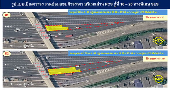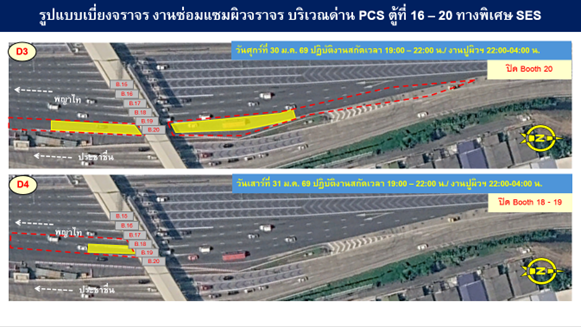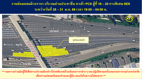 - ทางพิเศษศรีรัช บริเวณด่านประชาชื่น ขาเข้าในวันที่ 28 – 31 มกราคม 2569 ตั้งแต่เวลา 19.00 – 04.00 น.