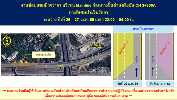 - ทางพิเศษประจิมรัถยา บริเวณก่อนทางขึ้นด่านตลิ่งชัน วันที่ 26 - 27 มกราคม 2569 ตั้งแต่เวลา 22.00 – 04.00 น.