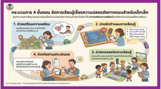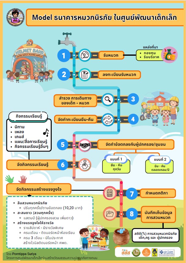 ประการที่ 2 ศูนย์พัฒนาเด็กเล็กเป็นจุดเชื่อมครอบครัว –ชุมชน- ท้องถิ่น” เด็กเล็กยังพึ่งพาผู้ปกครองในการเดินทางเป็นหลัก จึงเป็นการขยายผลสู่ผู้ปกครองและชุมชนผ่านข้อตกลงครอบครัว การรณรงค์เชิงพื้นที่ เพื่อลดพฤติกรรมเสี่ยงและการสวมหมวกนิรภัยเกิดขึ้นได้จริงในชีวิตประจำวัน และประการที่ 3 ศูนย์พัฒนาเด็กเล็กต้นแบบทำให้การขยายผลเกิดได้จริงและวัดผลได้” โครงการนี้ไม่ได้หยุดที่กิจกรรมการอบรม แต่เน้นการสร้างระบบหนุนเสริมต่อเนื่องผ่าน PLC และ Online Coaching พัฒนาคู่มือ แผนการเรียนรู้และสื่อ รวมถึงการติดตามสนับสนุนการดำเนินงานศูนย์พัฒนาเด็กเล็กที่เข้าร่วม “ทำได้จริง-ทำต่อเนื่อง-ทำแล้วเห็นผล” โดยผลการดำเนินงานที่ผ่านมาในจังหวัดอื่นพบว่า อัตราการสวมหมวกนิรภัยเพิ่มขึ้นในครูและนักเรียน 90-100% ผู้ปกครองเพิ่มขึ้น 70% เป็นเหตุผลเชิงประจักษ์ที่สนับสนุนว่า การลงทุนในกลไกศูนย์พัฒนาเด็กเล็กต้นแบบเป็นแนวทางที่คุ้มค่า ต่อยอดได้