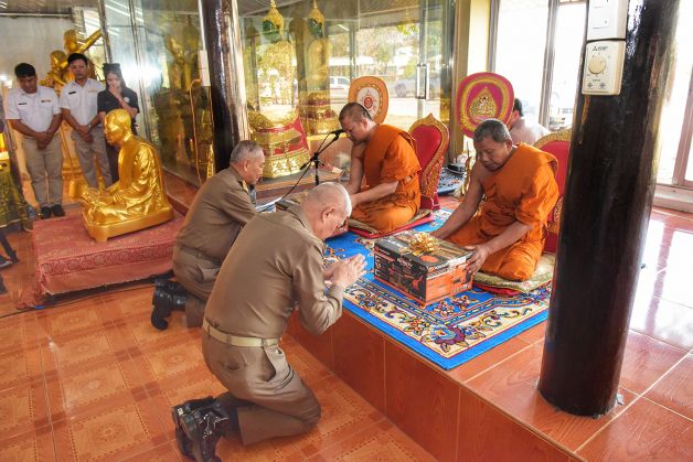 วันพฤหัสบดีที่ 29 มกราคม เวลา 09.30 น. พลอากาศเอก ชลิต พุกผาสุข องคมนตรี ประธานอนุกรรมการติดตามและขับเคลื่อนโครงการอันเนื่องมาจากพระราชดำริในพื้นที่ภาคกลาง พลอากาศเอก จอม รุ่งสว่าง องคมนตรี รองประธานอนุกรรมการฯ พร้อมด้วย นายศุภรัชต์ อินทราวุธ รองเลขาธิการ กปร. และคณะอนุกรรมการฯ เดินทางไปยังวัดสาลวนาราม ตำบลดอนตาเพชร อำเภอพนมทวน จังหวัดกาญจนบุรี เพื่อติดตามความคืบหน้าโครงการสถานีสูบน้ำด้วยไฟฟ้าพร้อมระบบส่งน้ำดอนตาเพชร 2 อันเนื่องมาจากพระราชดำริ อำเภอพนมทวน จังหวัดกาญจนบุรี โอกาสนี้ องคมนตรี ได้ถวายเครื่องไทยธรรม แด่พระสงฆ์ จำนวน 2 รูป จากนั้น รับฟังการบรรยายสรุปผลการดำเนินงานและการบริหารจัดการน้ำของโครงการ ในการนี้ องคมนตรี ได้ขอให้หน่วยงานที่เกี่ยวข้องร่วมกันดำเนินโครงการตลอดจนขยายผลการพัฒนาในด้านต่าง ๆ ทั้งดิน น้ำ เกษตร เพื่อสร้างประโยชน์แก่ประชาชนในพื้นที่ และขอให้จัดตั้งกลุ่มผู้ใช้น้ำ พัฒนาต่อยอดเป็นสหกรณ์กลุ่มผู้ใช้น้ำเพื่อร่วมกันบริหารจัดการน้ำให้เกิดความเป็นธรรมและเกิดประสิทธิภาพสูงสุดต่อไป พร้อมกันนี้ได้มอบเมล็ดพันธุ์ข้าวพระราชทานแก่ผู้แทนราษฎรจากนั้น ลงพื้นที่ตรวจเยี่ยมพื้นที่โครงการฯ .jpg)