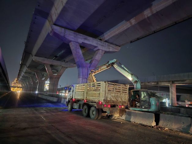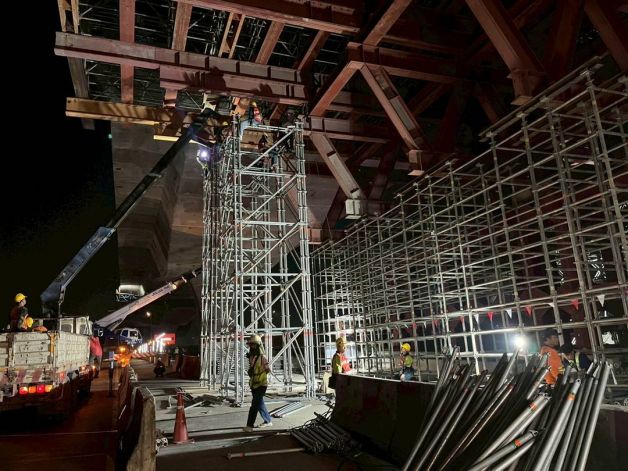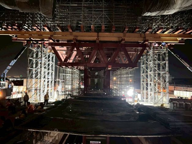 2. การปรับตำแหน่ง LG ชุดที่สอง: ดำเนินการเคลื่อนย้าย LG จากด้านขวาทาง เข้าสู่ตำแหน่งปฏิบัติงานเพื่อเตรียมรื้อถอนคานที่ชำรุด โดยปัจจุบันอยู่ระหว่างดำเนินการตามแผนงาน ซึ่งประกอบด้วยขั้นตอนการติดตั้งค้ำยัน (Main Support) และการเจาะคอนกรีตสำหรับติดตั้งโครงสร้างรองรับ (Supporting Frame)