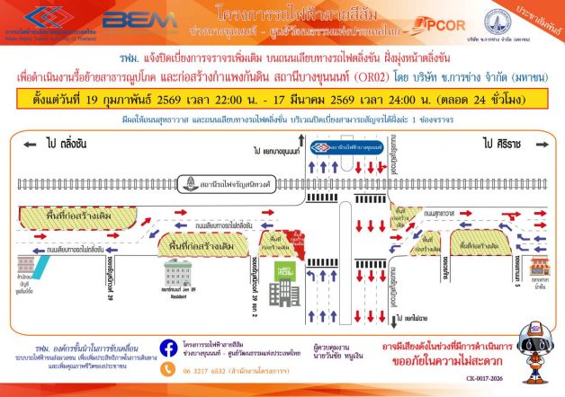 การรถไฟฟ้าขนส่งมวลชนแห่งประเทศไทย (รฟม.) แจ้งว่า บริษัท ช.การช่าง จำกัด (มหาชน) ผู้รับจ้างออกแบบและก่อสร้างอุโมงค์ทางวิ่งและสถานีใต้ดิน โครงการรถไฟฟ้าสายสีส้ม ช่วงบางขุนนนท์ – ศูนย์วัฒนธรรมแห่งประเทศไทย มีความจำเป็นต้องปิดเบี่ยงการจราจรเพิ่มเติม 2 ช่องจราจร บนถนนเลียบทางรถไฟตลิ่งชัน ฝั่งมุ่งหน้าตลิ่งชัน เพื่อดำเนินงานรื้อย้ายสาธารณูปโภค และก่อสร้างกำแพงกันดิน สถานีบางขุนนนท์ (OR02) ตั้งแต่วันที่ 19 กุมภาพันธ์ 2569 เวลา 22:00 น. – 17 มีนาคม 2569 เวลา 24:00 น. (ตลอด 24 ชั่วโมง)