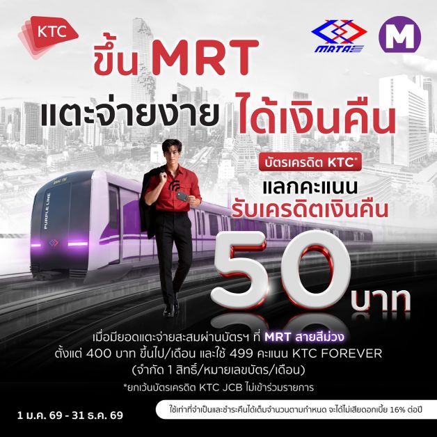 1. บริษัท บัตรกรุงไทย จำกัด (มหาชน) มอบสิทธิประโยชน์ให้แก่ผู้ใช้บริการรถไฟฟ้าที่แตะบัตรชำระค่าโดยสารผ่านบัตรเครดิต KTC ที่รถไฟฟ้า MRT สายสีน้ำเงินหรือสายสีม่วง จะได้รับเครดิตเงินคืน 50 บาท เมื่อมียอดแตะจ่ายสะสมตั้งแต่ 400 บาทขึ้นไป/เดือน และใช้คะแนนสะสม KTC FOREVER 499 คะแนน แลกรับเครดิตเงินคืน ตั้งแต่วันที่ 1 มกราคม – 31 ธันวาคม 2569 รายละเอียดเพิ่มเติม โทร. 0 2123 5000