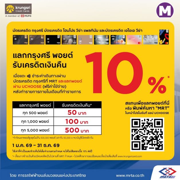 มอบสิทธิประโยชน์ให้แก่ผู้ใช้บริการที่แตะบัตรชำระค่าโดยสารผ่านบัตรเครดิตกรุงศรี ที่รถไฟฟ้า MRT สายสีน้ำเงินหรือสายสีม่วง แลกกรุงศรี พอยต์ทุก 500 พอยต์ จะได้รับเครดิตเงินคืน 50 บาท แลกกรุงศรี พอยต์ทุก 1,000 พอยต์ จะได้รับเครดิตเงินคืน 100 บาท และแลกกรุงศรี พอยต์ทุก 5,000 พอยต์ จะได้รับเครดิตเงินคืน 500 บาท โดยจำกัดการแลกเครดิตเงินคืน 50,000 บาท/บัญชีบัตรหลัก/วัน ตั้งแต่วันที่ 1 มกราคม – 31 ธันวาคม 2569 รายละเอียดเพิ่มเติมโทร. 0 2646 3555 หรือ