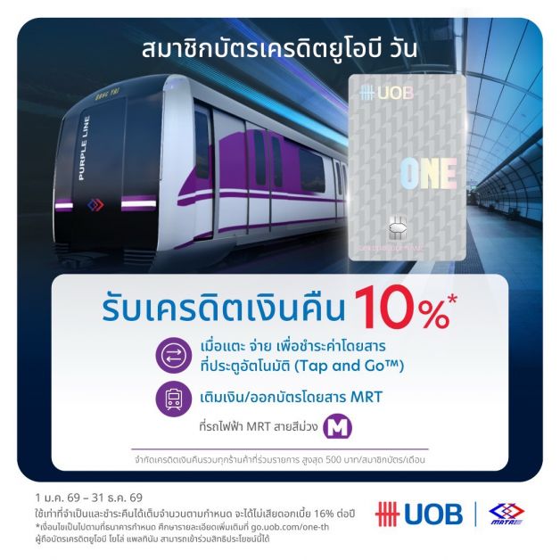 มอบสิทธิพิเศษให้แก่ผู้ใช้บริการรถไฟฟ้าที่แตะบัตรชำระค่าโดยสารผ่านบัตรเครดิตยูโอบี วันที่รถไฟฟ้า MRT สายสีน้ำเงินหรือสายสีม่วง จะได้รับเครดิตเงินคืน 10% โดยจำกัดการรับเครดิตเงินคืนรวมสูงสุด 500 บาท/คน/เดือน ตั้งแต่วันที่ 1 มกราคม – 31 ธันวาคม 2569 รายละเอียดเพิ่มเติมโทร. 0 2285 1555 หรือ