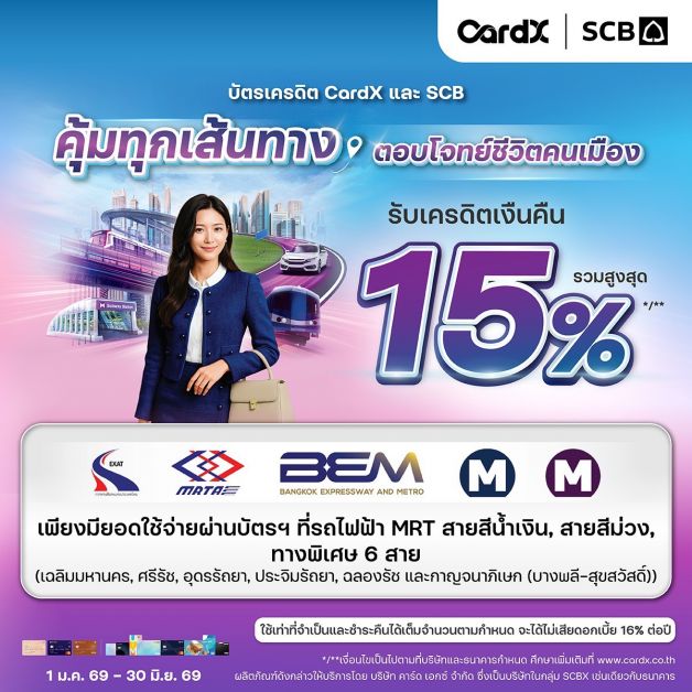 4. บริษัท คาร์ด เอกซ์ จำกัด มอบสิทธิประโยชน์ให้แก่ผู้ใช้บริการรถไฟฟ้าที่แตะบัตรชำระค่าโดยสารผ่านบัตรเครดิต CardX /บัตรเครดิต SCB สะสมครบ 1,000 บาท/เดือน จะได้รับเครดิตเงินคืนสูงสุด 50 บาท/เดือน และสามารถใช้คะแนน PointX แลกรับเครดิตคืนได้สูงสุด 100% เท่ายอดใช้จ่าย จำกัดการแลกคะแนนเพื่อรับเครดิตเงินคืนสูงสุด 2,000 บาท/บัตร/เดือน ตั้งแต่วันที่ 1 มกราคม – 30 มิถุนายน 2569 รายละเอียดเพิ่มเติม ศูนย์บริการลูกค้าคาร์ดเอกซ์ โทร.1468 สำหรับบัตรเครดิตคาร์ดเอกซ์ หรือศูนย์บริการลูกค้าไทยพาณิชย์ โทร. 02-777-7777 สำหรับบัตรเครดิตไทยพาณิชย์