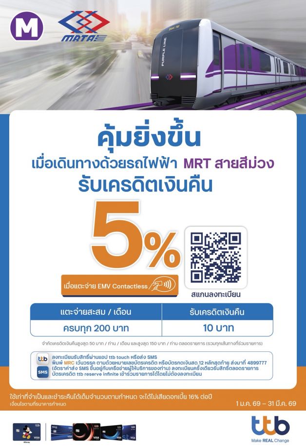 5. ธนาคารทหารไทยธนชาต จำกัด (มหาชน) มอบสิทธิประโยชน์ให้แก่ผู้ใช้บริการรถไฟฟ้าที่แตะบัตรชำระค่าโดยสารผ่านบัตรเครดิต ttb จะได้รับเครดิตเงินคืน 5% สะสมครบ 200 บาท/เดือน โดยจำกัดการรับเครดิตเงินคืนรวมสูงสุด 50 บาท/คน/เดือน ตั้งแต่วันที่ 1 มกราคม – 31 มีนาคม 2569 รายละเอียดเพิ่มเติมโทร. 1428 หรือ