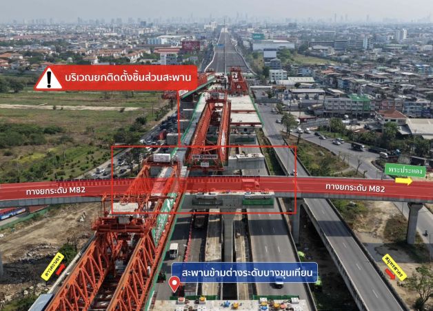กทพ. แจ้งเบี่ยงจราจรทางยกระดับ M82 (ขาเข้า) ลงด่านพันท้ายนรสิงห์ ชั่วคราว 1 – 6 มีนาคม 2569 เพื่อดำเนินการยกติดตั้งชิ้นส่วนสะพานต่างระดับบางขุนเทียน