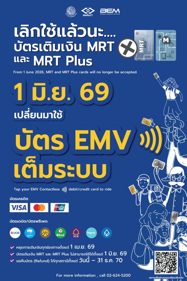 นายอนวัช สุวรรณฤทธิ์ รองกรรมการผู้จัดการ BEM ในฐานะผู้ให้บริการรถไฟฟ้า MRT สายสีน้ำเงิน และสายสีม่วง กล่าวว่า “ภายใต้วิสัยทัศน์การพัฒนาคุณภาพชีวิตด้วยเทคโนโลยีที่ทันสมัย พร้อมยกระดับการเดินทาง เข้าสู่การชำระเงินแบบไร้รอยต่อ (Seamless Payment) ตลอด 5 ปีที่ผ่านมา BEM ได้เดินหน้าพัฒนาระบบจัดเก็บค่าโดยสารอัตโนมัติอย่างต่อเนื่องเพื่อรองรับ EMV Contactless ซึ่งเป็นระบบที่ทันสมัยที่สุดในปัจจุบัน และมีเทคโนโลยีด้านความปลอดภัยที่มีมาตรฐานสากล เช่นเดียวกับหัวเมืองใหญ่ทั่วโลก ทั้งนี้ ผู้ใช้บริการรถไฟฟ้า MRT สายสีน้ำเงิน และสายสีม่วง จะใช้บัตรโดยสารแบบเติมเงิน MRT และ MRT Plus ได้จนถึงวันที่ 31 พฤษภาคม 2569 และตั้งแต่วันที่ 1 มิถุนายน 2569 จะเปลี่ยนเป็นการใช้บัตรมาตรฐาน EMV Contactless ต่างๆ อาทิ บัตรแมงมุม EMV บัตรเครดิต EMV บัตรเดบิต EMV ฯลฯ อย่างเต็มรูปแบบ เพื่อมุ่งสู่การเป็นศูนย์กลางการเชื่อมต่อการเดินทางของคนเมือง (Connectivity Hub) พร้อมให้การสนับสนุนระบบตั๋วร่วมของภาครัฐในอนาคต”