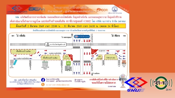 รฟม. แจ้งปิดเบี่ยงการจราจรเพิ่มเติม บนถนนเลียบทางรถไฟตลิ่งชัน ฝั่งมุ่งหน้าตลิ่งชัน และบนถนนสุทธาวาส ฝั่งมุ่งหน้าศิริราช ตั้งแต่วันที่ 2 มีนาคม 2569 เวลา 22:00 น. – 31 มีนาคม 2569 เวลา 24:00 น. (ตลอด 24 ชั่วโมง)