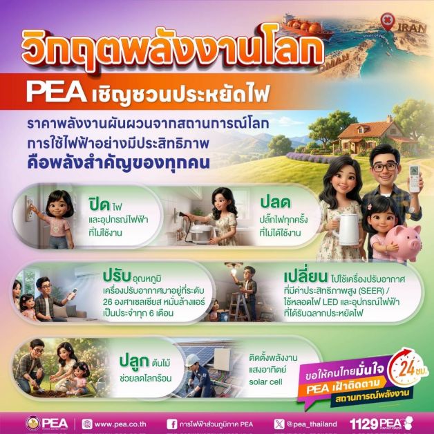 จากสถานการณ์วิกฤตพลังงานโลก การไฟฟ้าส่วนภูมิภาค (PEA) ติดตามสถานการณ์ความตึงเครียดด้านพลังงานในภูมิภาคตะวันออกกลางอย่างใกล้ชิด ซึ่งอาจส่งผลต่อแนวโน้มราคาพลังงานในตลาดโลก และกระทบต่อค่าครองชีพของประชาชน PEA จึงขอเชิญชวนประชาชนร่วมกันใช้ไฟฟ้าอย่างประหยัดและมีประสิทธิภาพ เพื่อช่วยลดภาระค่าใช้จ่ายและสนับสนุนการใช้พลังงานของประเทศอย่างคุ้มค่า