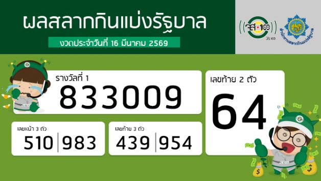 ผลสลากกินแบ่งรัฐบาลงวดประจำวันที่ 16 มีนาคม 2569