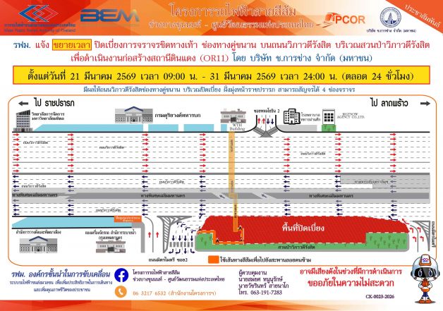 รฟม. แจ้งขยายเวลาปิดเบี่ยงการจราจรชิดทางเท้า ช่องทางคู่ขนาน บนถนนวิภาวดีรังสิต บริเวณสวนป่าวิภาวดีรังสิต เพื่อดำเนินงานก่อสร้างสถานีดินแดง (OR11) ในวันที่ 21 มีนาคม 2569 เวลา 09:00 น. – 31 มีนาคม 2569 เวลา 24:00 น. (ตลอด 24 ชั่วโมง)