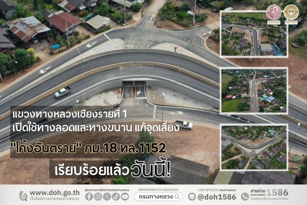 แขวงทางหลวงเชียงรายที่ 1 เปิดใช้ทางลอดและทางขนาน แก้จุดเสี่ยง "โค้งอันตราย" กม.18 ทล.1152 เรียบร้อยแล้ววันนี้!