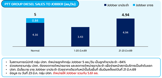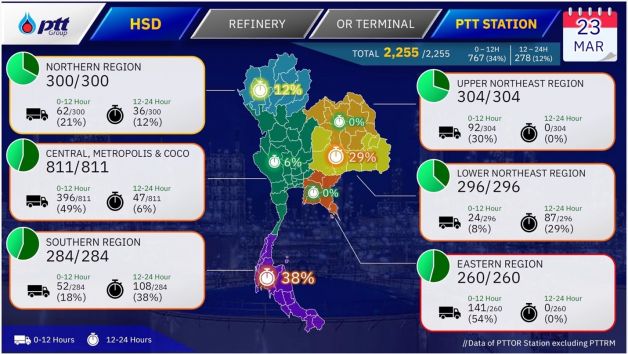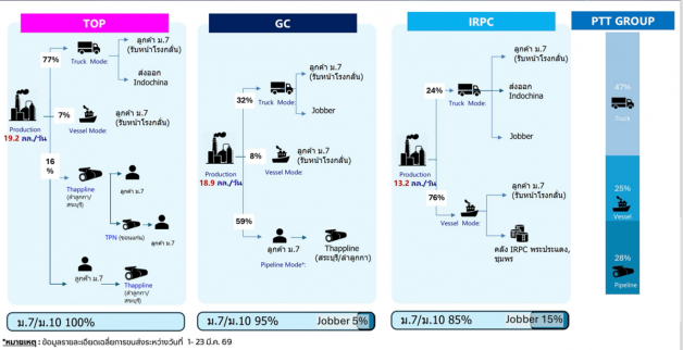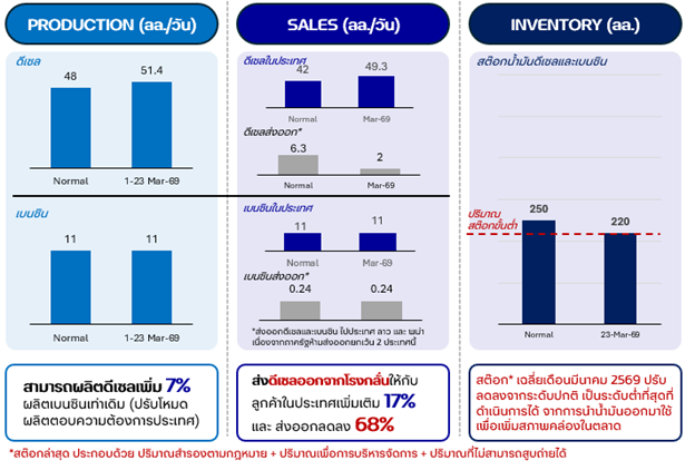 บริษัท ปตท. จำกัด (มหาชน) (ปตท.) เปิดเผยว่า กลุ่ม ปตท. เร่งผลิตและกระจายน้ำมันเต็มกำลัง เพื่อให้ประชาชนมีพลังงานใช้อย่างเพียงพอในช่วงที่ความต้องการใช้น้ำมันเพิ่มสูงขึ้น โดยโรงกลั่นในกลุ่ม ปตท. ซึ่งประกอบด้วยโรงกลั่นของบริษัท Thai Oil Public Company Limited (TOP), PTT Global Chemical Public Company Limited (GC) และ IRPC Public Company Limited (IRPC) เดินเครื่องผลิตเฉลี่ย 105% ของกำลังการผลิต และเปิดคลังน้ำมันตลอด 24 ชั่วโมง 7 วัน เพื่อกระจายน้ำมันไปยังสถานีบริการและผู้ค้าส่งทั่วประเทศอย่างต่อเนื่อง