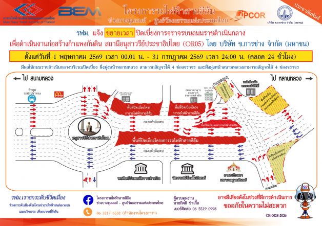 การรถไฟฟ้าขนส่งมวลชนแห่งประเทศไทย (รฟม.) แจ้งว่า บริษัท ช.การช่าง จำกัด (มหาชน) ผู้รับจ้างออกแบบและก่อสร้างอุโมงค์ทางวิ่งและสถานีใต้ดิน โครงการรถไฟฟ้าสายสีส้ม ช่วงบางขุนนนท์ – ศูนย์วัฒนธรรมแห่งประเทศไทย มีความจำเป็นต้องขยายเวลาปิดเบี่ยงการจราจรบนถนนราชดำเนินกลาง เพื่อดำเนินงานก่อสร้างกำแพงกันดิน สถานีอนุสาวรีย์ประชาธิปไตย (OR05) ตั้งแต่วันที่ 1 พฤษภาคม 2569 เวลา 00:01 น. – 31 กรกฎาคม 2569 เวลา 24:00 น. (ตลอด 24 ชั่วโมง) โดยมีรายละเอียดดังนี้