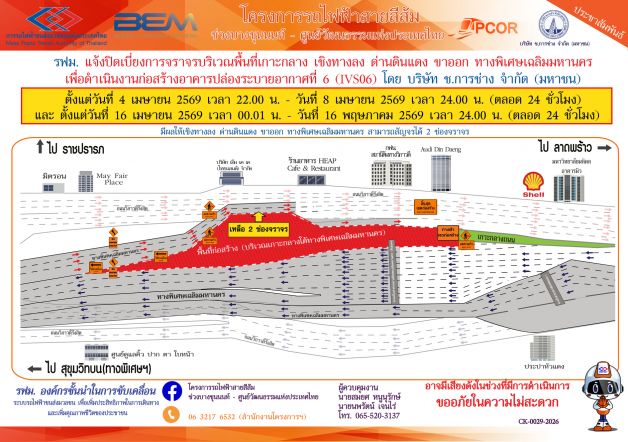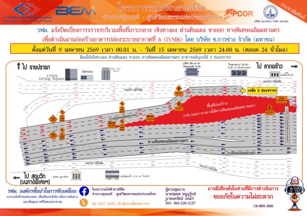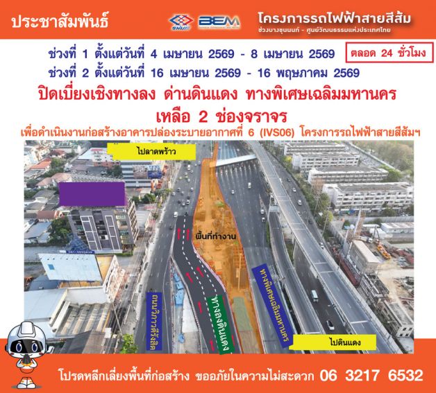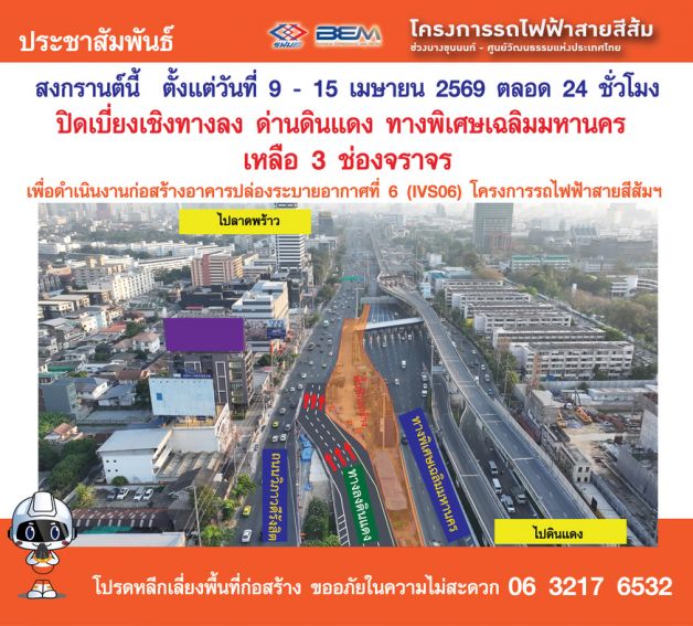 การรถไฟฟ้าขนส่งมวลชนแห่งประเทศไทย (รฟม.) แจ้งว่า บริษัท ช.การช่าง จำกัด (มหาชน) ผู้รับจ้างออกแบบและก่อสร้างอุโมงค์ทางวิ่งและสถานีใต้ดิน โครงการรถไฟฟ้าสายสีส้ม ช่วงบางขุนนนท์ - ศูนย์วัฒนธรรมแห่งประเทศไทย มีความจำเป็นต้องปิดเบี่ยงการจราจรบริเวณพื้นที่เกาะกลาง เชิงทางลง ด่านดินแดง ขาออก ทางพิเศษเฉลิมมหานคร เพื่อดำเนินงานก่อสร้างอาคารปล่องระบายอากาศที่ 6 (IVS06) ตั้งแต่วันที่ 4 เมษายน 2569 เวลา 22.00 น. – วันที่ 16 พฤษภาคม 2569 เวลา 24.00 น. (ตลอด 24 ชั่วโมง) มีรายละเอียดดังนี้
