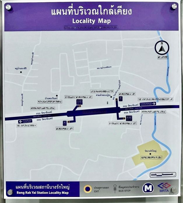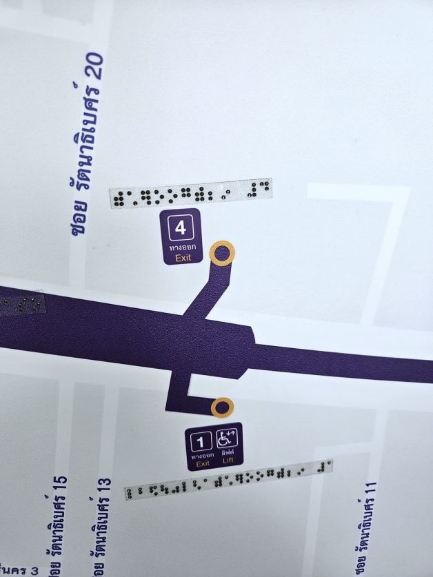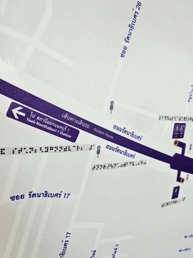 ตามที่ การรถไฟฟ้าขนส่งมวลชนแห่งประเทศไทย (รฟม.) ร่วมกับ สมาคมคนตาบอดแห่งประเทศไทยพัฒนาการจัดทำแผนที่การเดินทางสำหรับคนพิการทางการเห็นภายในสถานีรถไฟฟ้ามหานคร สายฉลองรัชธรรม (MRT สายสีม่วง) เพื่ออำนวยความสะดวกและตอบสนองความต้องการของผู้ใช้บริการรถไฟฟ้าที่เป็นคนพิการทางการเห็น โดย รฟม. ได้มีการนำข้อเสนอแนะจากสมาคมคนตาบอดฯ ให้ผู้รับสัมปทาน บริษัท ทางด่วนและรถไฟฟ้ากรุงเทพ จำกัด (มหาชน) (BEM) ไปดำเนินการปรับปรุงและเร่งรัดการติดตั้งให้ครบทั้ง 16 สถานี นั้น