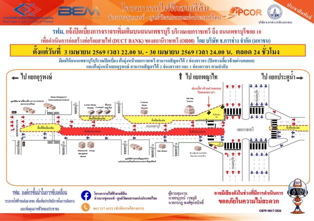 ประชาสัมพันธ์ #แจ้งปิดเบี่ยงการจราจรเพิ่มเติมบนถนนเพชรบุรี บริเวณแยกราชเทวี ถึง ซอยเพชรบุรี 10 เพื่อดำเนินการก่อสร้างท่อร้อยสายไฟ (DUCK BANK) ของสถานีราชเทวี (OR08) โครงการรถไฟฟ้าสายสีส้ม ช่วงบางขุนนนท์ - ศูนย์วัฒนธรรมแห่งประเทศไทย ตั้งแต่วันที่ 3 เมษายน 2569 เวลา 22.00 น. – 30 เมษายน 2569 เวลา 24.00 น. ตลอด 24 ชั่วโมง
